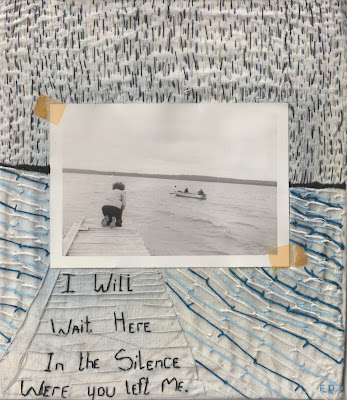I finally finished this drawing today. Well it's more of a collage. The monoprint at the base is done by the artist Dawn West. When Dawn sends gifts she uses her old prints to wrap them. I always keep what I can. This bit was hanging in my studio and I was compelled to use it. When I first worked on this it didn't work out (see below) with some advice from Dawn I cut out the feet and print and placed them on a new piece of paper. Keeping just a small bit of the small silver fish drawings. Adding pressed flowers and drawings of forget me nots.
